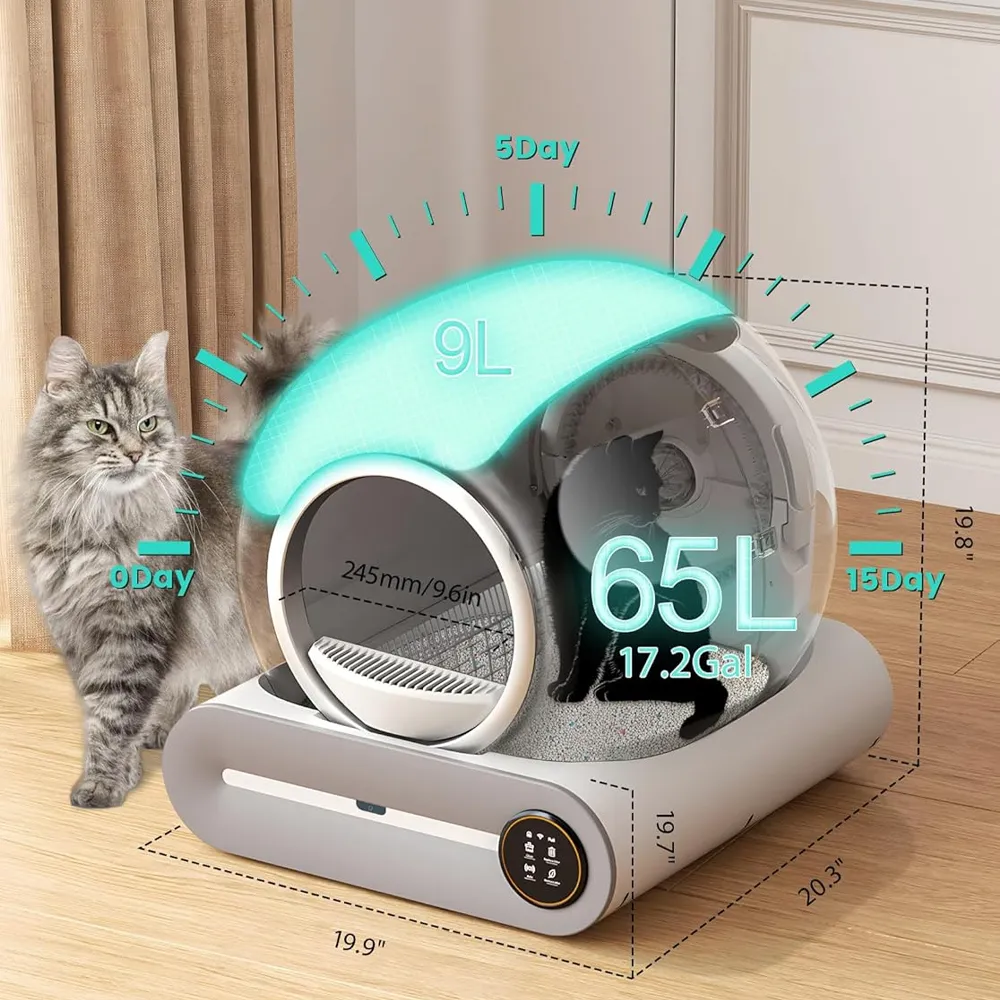 The self-cleaning litter box combines a litter box and fecal bin in one, with an all-in-one waste disposal system that replaces the traditional drawer method of collection and won't leave your cat trapped in the litter box. With 65L of toilet space and 9L of fecal collection space. With the toilet frequency statistics on the app, the pet's health condition is clear at a glance.