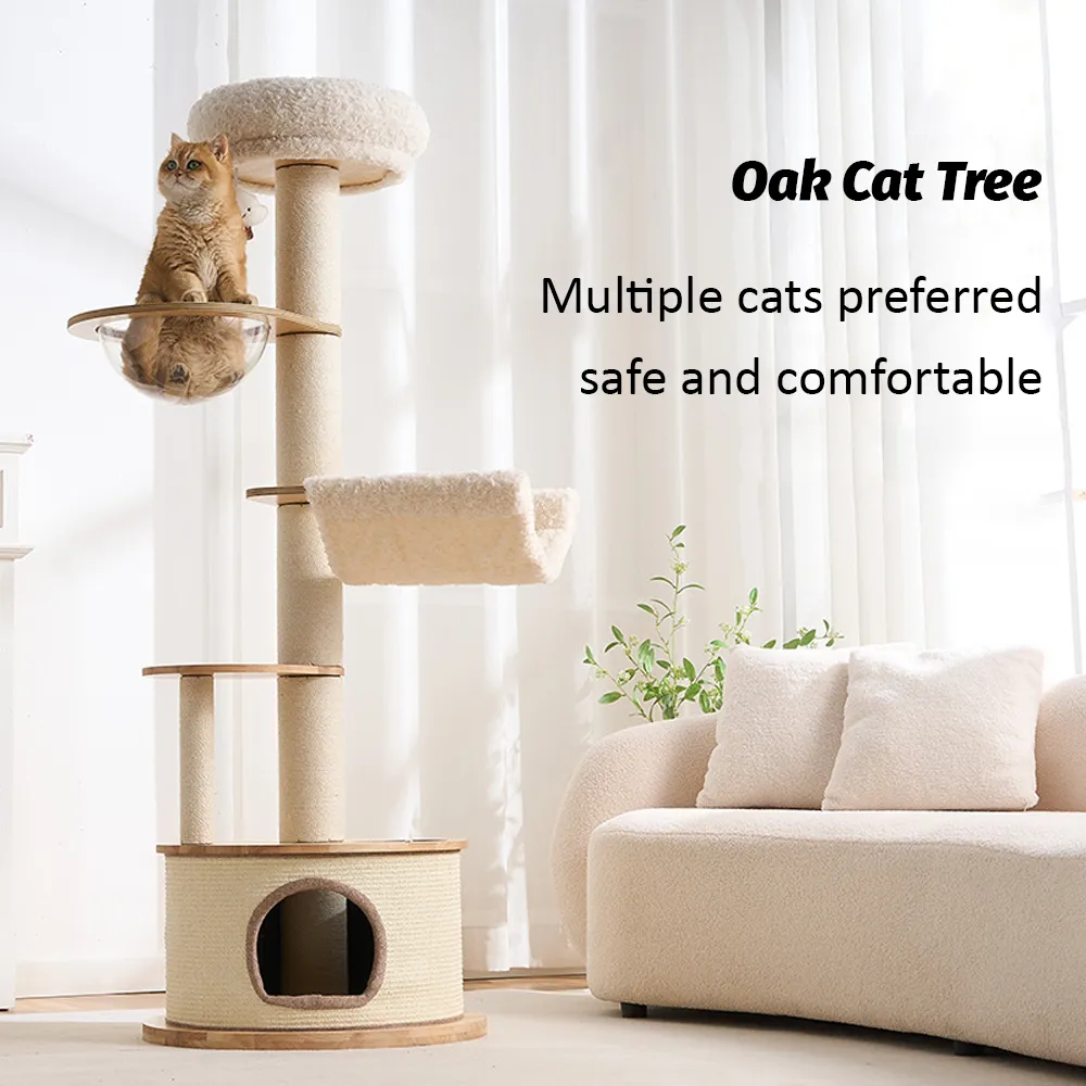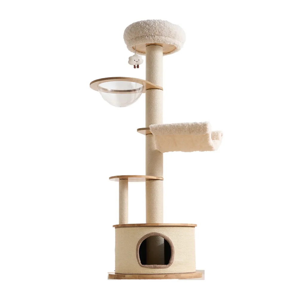 Equipped with roomy cat beds and cat condos, tailor-made for multi-cat households. The top viewing platform lets kitties survey their "territory"; the space capsule cat bed conforms to the curves of a cat's body, making it an ideal place for relaxation and rest; the semi-enclosed burlap cat bed satisfies the cat's natural instinct to hide.