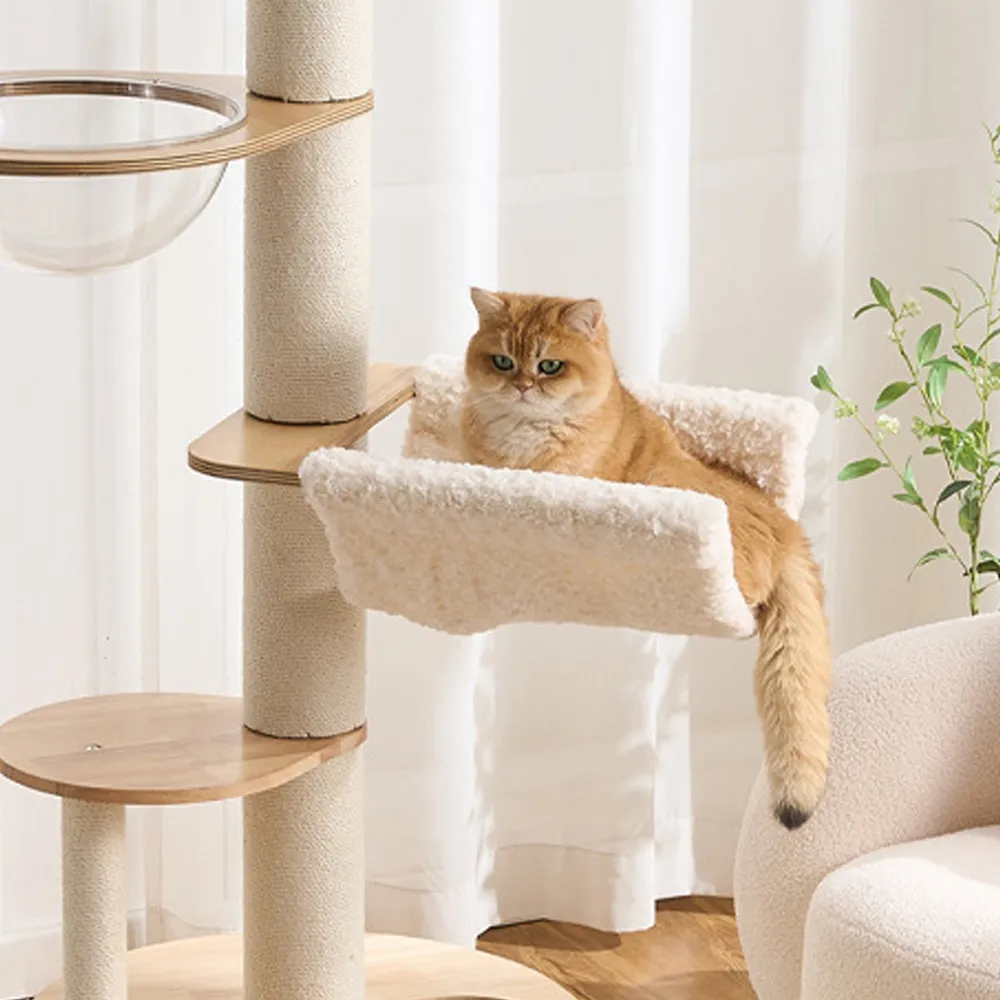 Clean lines, warm wood tones, and soft textures blend seamlessly into modern interiors—designed for pet parents who value aesthetics as much as function. The structure with rubber wood can withstand the scratching, climbing, and jumping of active cats, providing a long-lasting construction for them to play on.