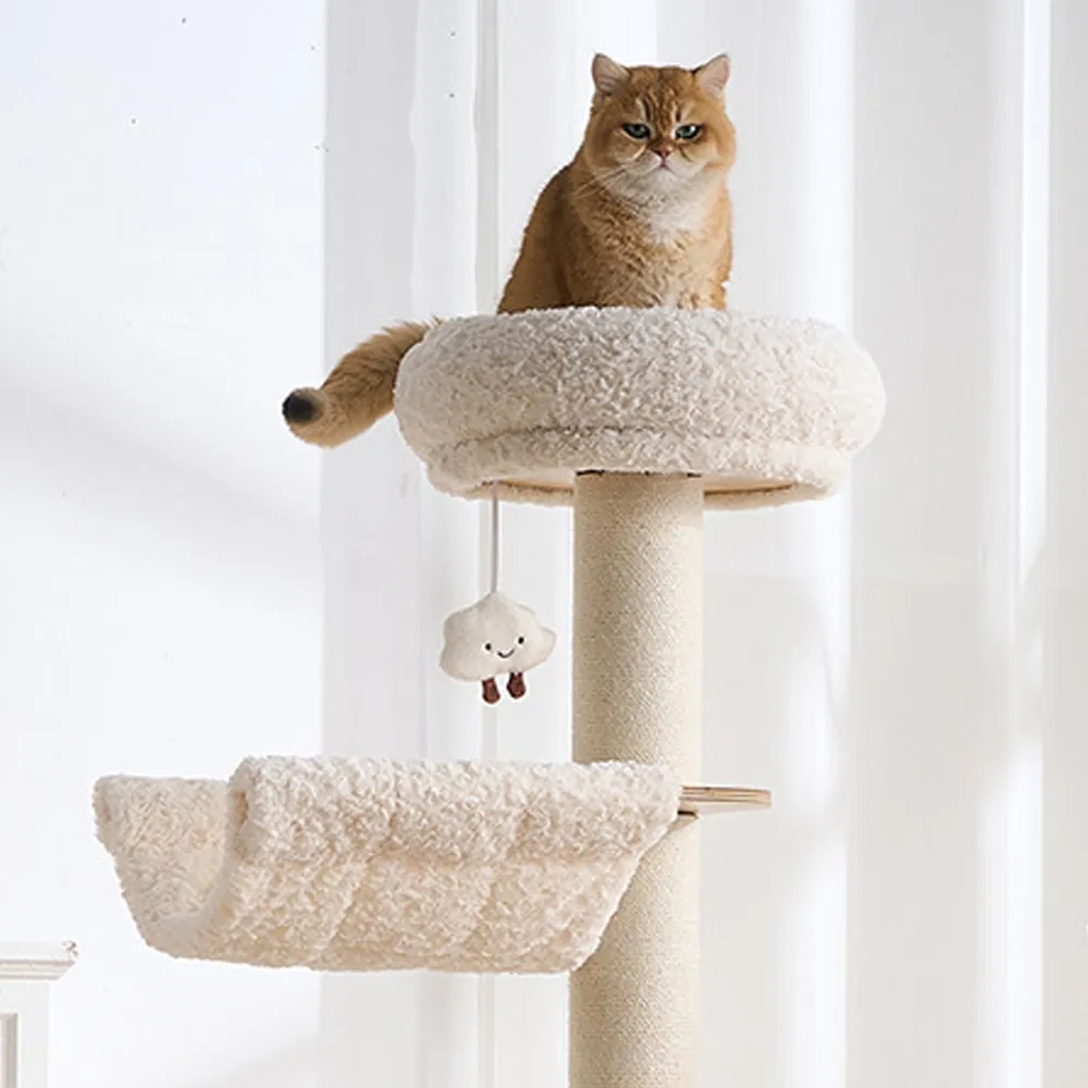 The aesthetic cat tree made of natural white hemp and rubber wood board that modern neutral design blending seamlessly with home decor. Scratching posts wrapped in durable sisal rope; cat beds lined with high-quality rose velvet that can protect furniture.