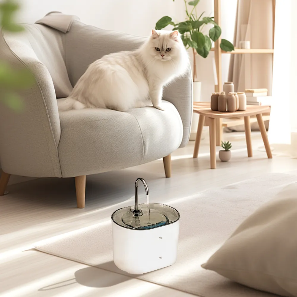 The cat water fountain has 2.2L (72oz), so you don't need to refill it frequently. A cat water fountain filled with water can provide your pet with 3-5 days of drinking water. The cat water fountain has a detachable design and its parts are removable, which is very convenient for you to replace or clean.