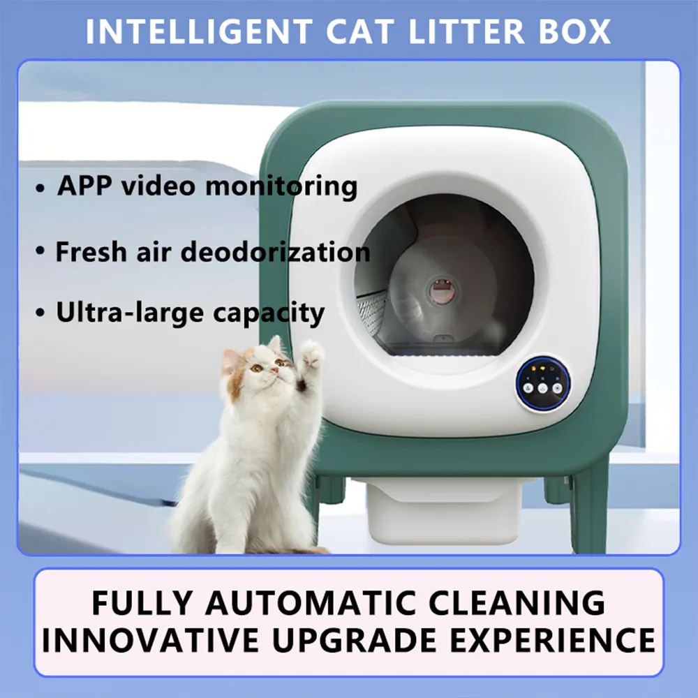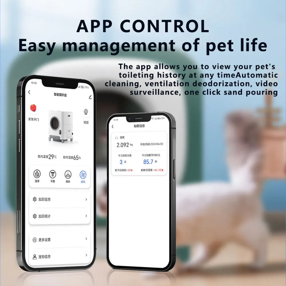 The app allows you to view your pet's toileting history at any time, automatic cleaning, ventilation and deodorization video surveillance, one click sand pouring. Equipped with 2.4GHz Wi-Fi and Bluetooth connectivity, this litter box integrates seamlessly with the app. Easily track your cat’s health and activity, including weight and litter box usage, in real time.