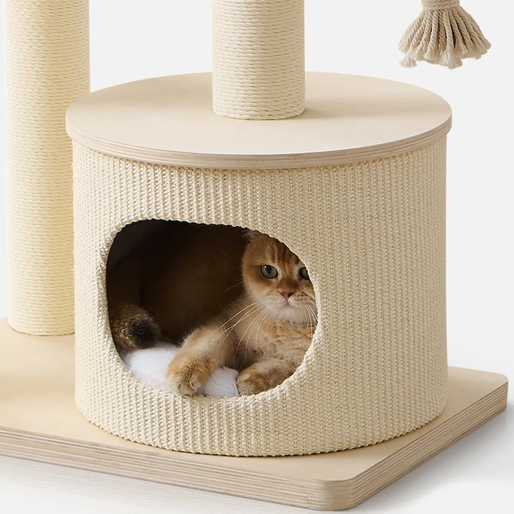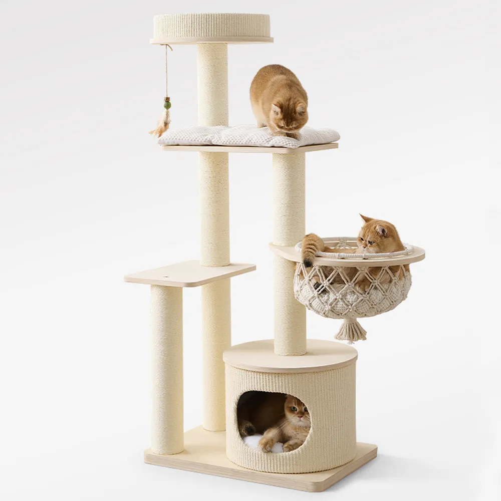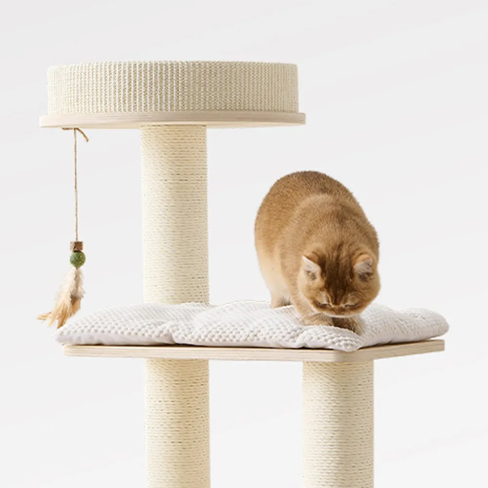 Modern cat tower with scratching post Made from natural paper fiber, wooden cat tree material is highly wear-resistant and perfect for scratching. solid wood cat tree tough enough to withstand your cat's instincts without shedding lots of debris or fluff. This allows your cat to satisfy its need to scratch, mark its territory, and enjoy climbing—all while protecting your sofa and curtains.