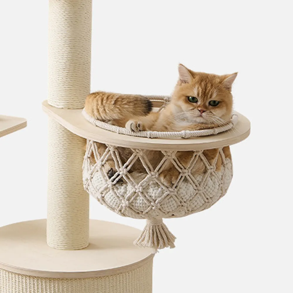 The luxurious multi-layered modern cat tree tower perfectly adapts to various home decoration styles. The circular white platform and lightweight and elegant suspended woven hammock make it a decorative addition to any room, especially in the living room. The spacing and size of each platform are carefully designed to allow your cat to crawl, jump, play, hide, relax, or sleep.